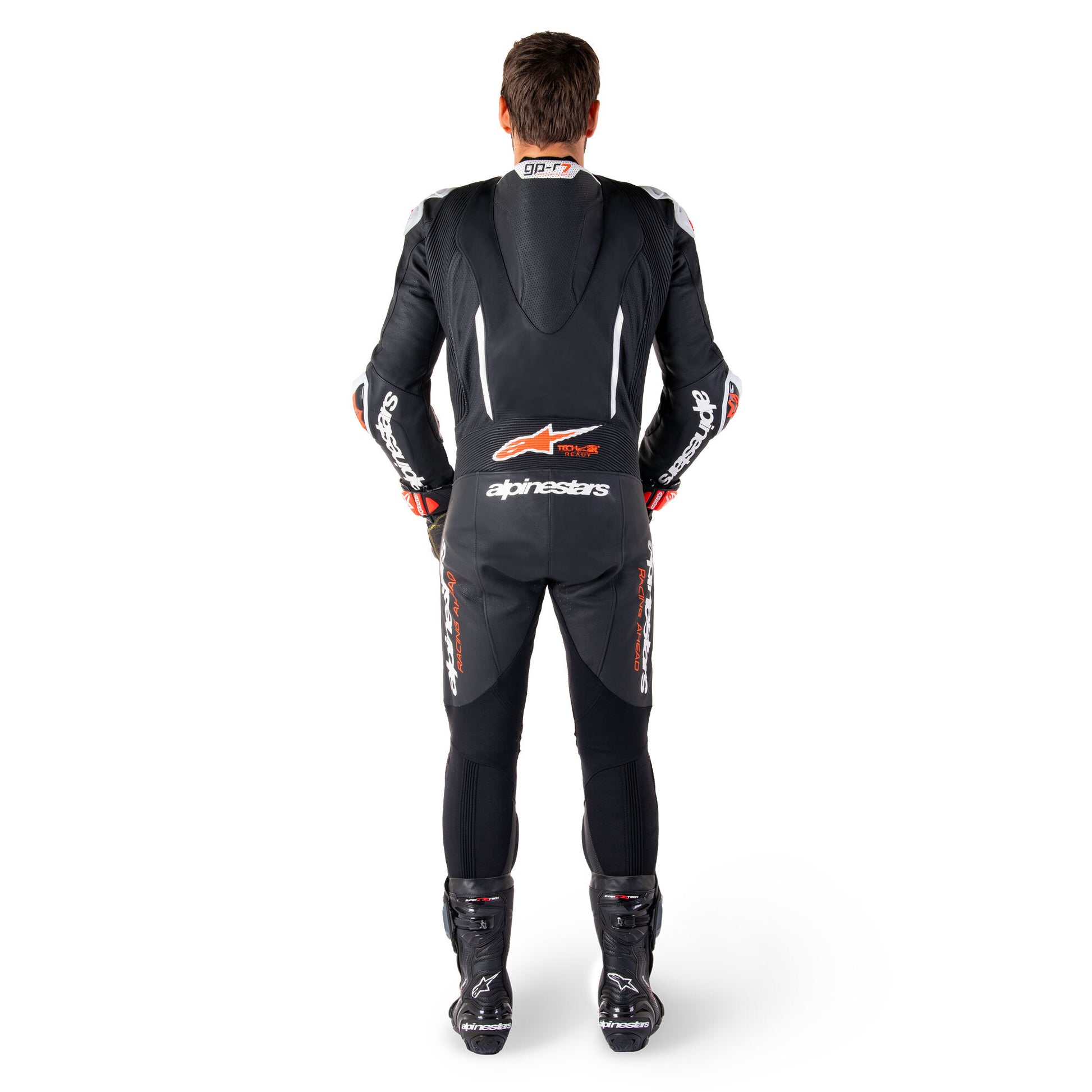 • Pre-curved arms, legs and body, with extended multi-directional leather accordions at the shoulder blades, lower back, and knees for an enhanced 'Race Fit'.