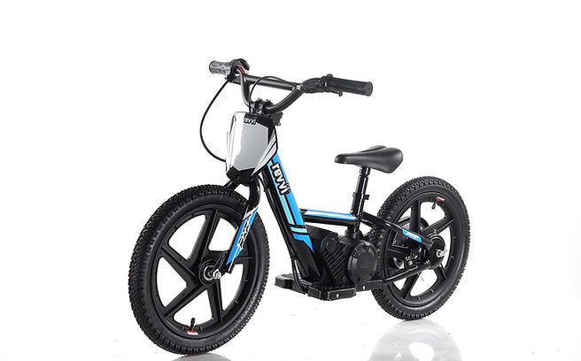 A super light electric-powered motor bike that has been specifically designed for kids, Weighing in at only 11kg's. The bike can be used as a conventional balance bike when learning to balance with its specially designed free wheel system. Then watch the rider improve and progress onto the slow speed setting (8mph) balancing on their own using the foot pegs. Perfecting their throttle control at the same time using the bikes twist throttle. Once they are confident using the slow speed setting they can then progress to the fast speed setting (12mph). Features hybrid rubber air filled tyres suitable for various ground types & a chain-driven motor that delivers reliable performance.